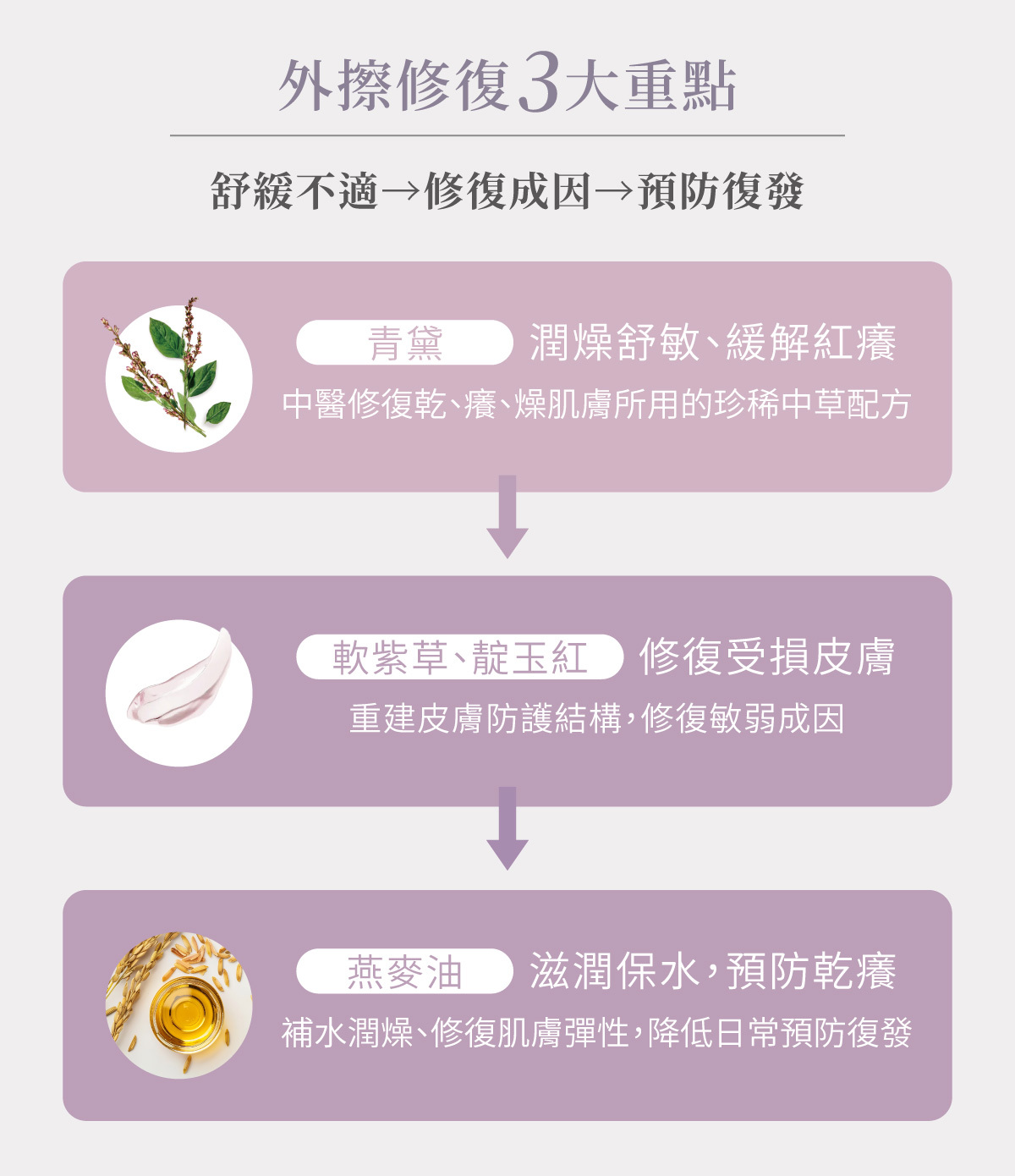 修復受損皮膚、預防搔抓:修復階段,會著重於重建皮膚防護結構,選用具修復特性的紫草類中草;同時透過專利萃取技術,從青黛中保留其有效活性「靛玉紅」並濾除雜質,使成分更穩定、親膚性更高,修復敏弱成因,讓肌膚屏障重建更完整。