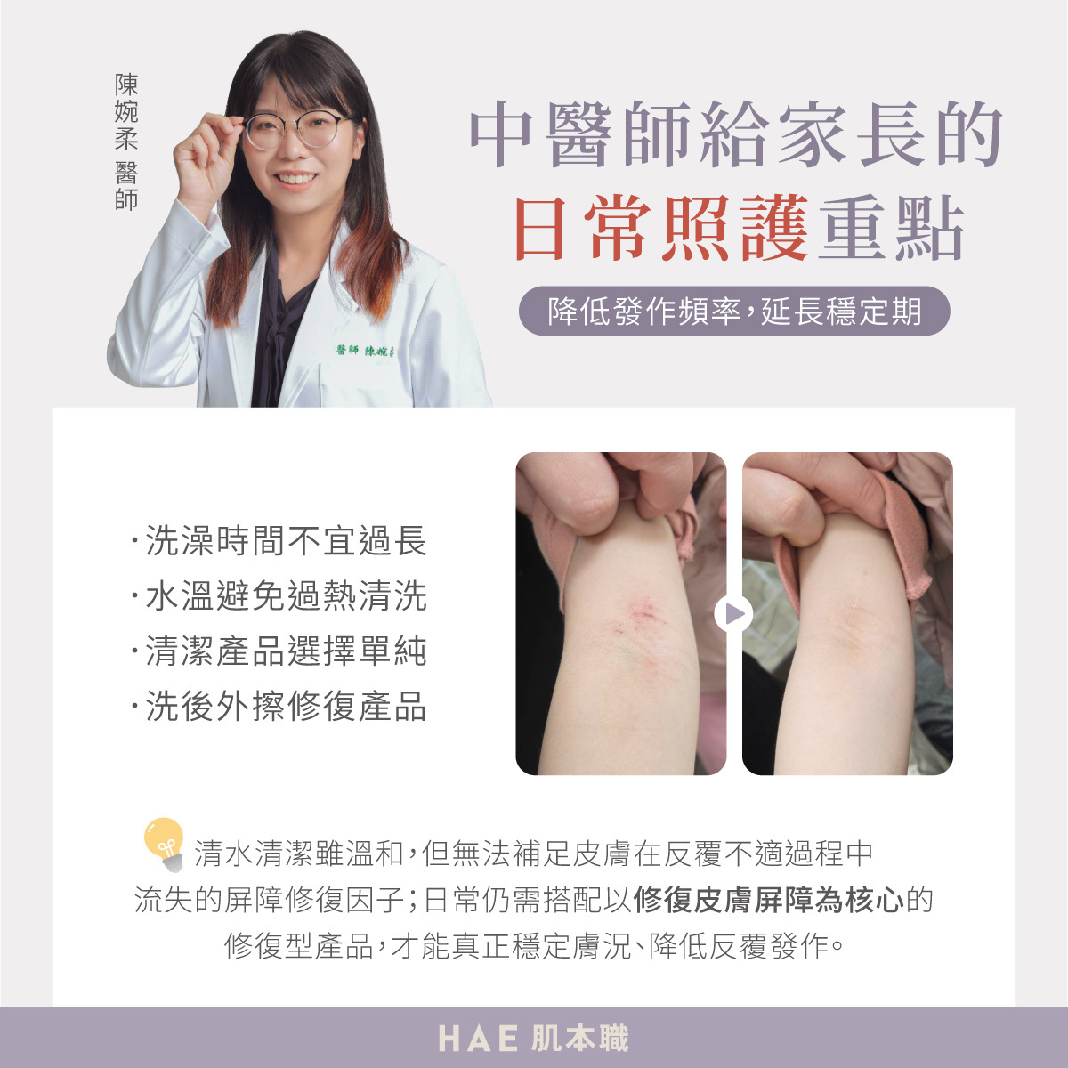 陳婉柔中醫師也提醒到日常照護需注意:洗澡時間不宜過長、水溫避免過熱,避免過度清潔;洗後立即外擦同時具備舒緩不適與修復皮膚屏障功能的修復型產品,在溫和不刺激的前提下,幫助皮膚重建防護力,作為異位性皮膚炎孩子的長期照護基礎。